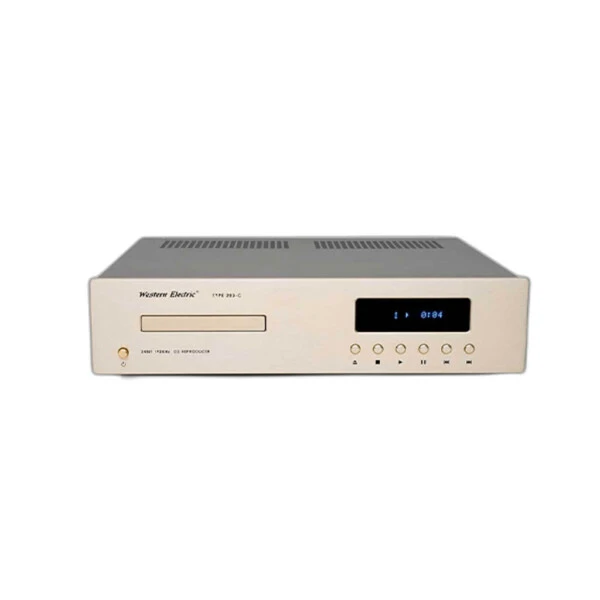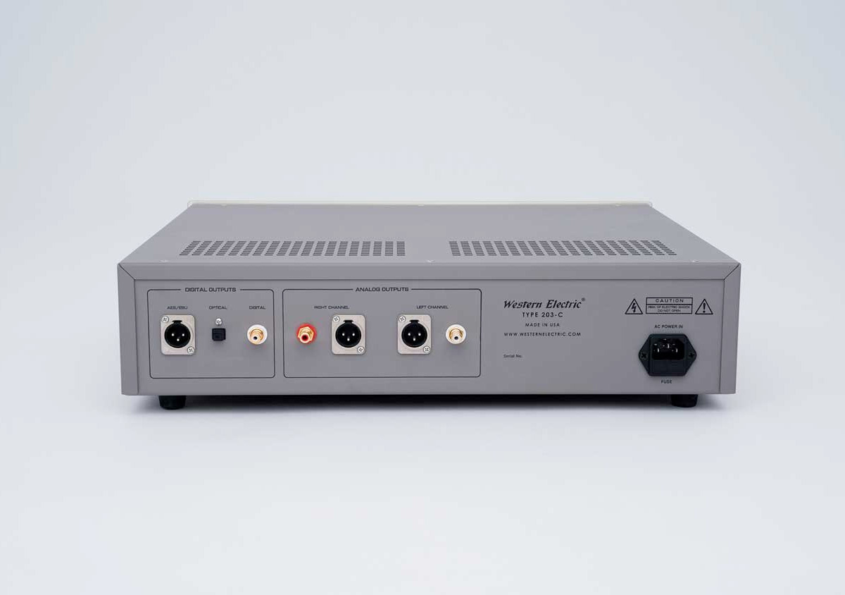 La plupart des audiophiles possèdent un lecteur CD dans leur système afin de profiter des nombreux enregistrements qui ne sont plus disponibles sur le vinyle. Le Western Electric 203C promet de nombreuses années d’utilisation. C’est un lecteur fiable et sur lequel vous pouvez compter. Il se compose d’un châssis pesant 18 kg apte à annuler toute résonance. Son convertisseur numérique/analogique Analog Device AD1955 multibit Sigma Delta s’occupe de réduire le jitter à néant. Bien entendu, les étages de sortie utilisent des tubes. Le 203C dépasse les limites techniques du CD avec une restitution fluide, pleine de vie, naturelle, avec du poids et de la présence. Les basses descendent très bas, le médium est magnifique, l’aigu est flamboyant. Le Western Electric 203C dispose de multiples sorties analogiques et numériques pour s’insérer dans tout système haute-fidélité.
