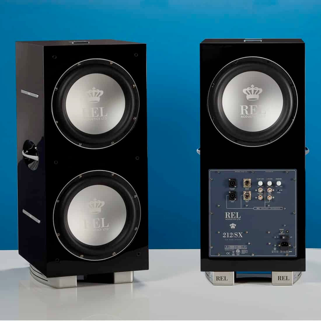 Le caisson de basse 212/SX est exceptionnel, dans son format comme par ses performances. Son ébénisterie verticale à la finition exemplaire marie la laque piano avec les inserts métalliques, le tout reposant sur de solides pieds amortissant affichant clairement la référence du caisson. Le 212/SX contient pas moins de quatre haut-parleurs. Les deux en façade de 30 cm avec membrane aluminium l’un au-dessus de l’autre sont actifs, alimentés par 1000 watts de puissance. A l’arrière prend place un modèle identique mais passif. Un second radiateur passif est placé sous le caisson, orienté vers le sol, toujours avec une membrane de 30 cm, mais cette fois plane. Ce caisson est capable de reproduire les graves avec force dans des pièces de grand volume, tout comme les passage les plus doux pour renforcer n’importe quel système stéréo haut de gamme.