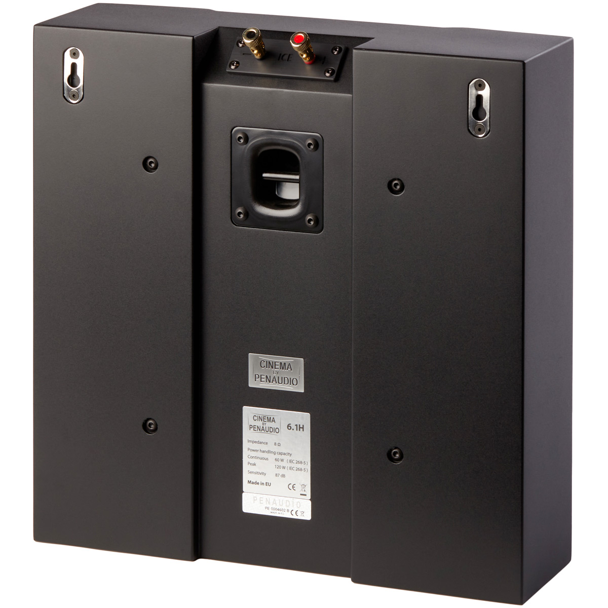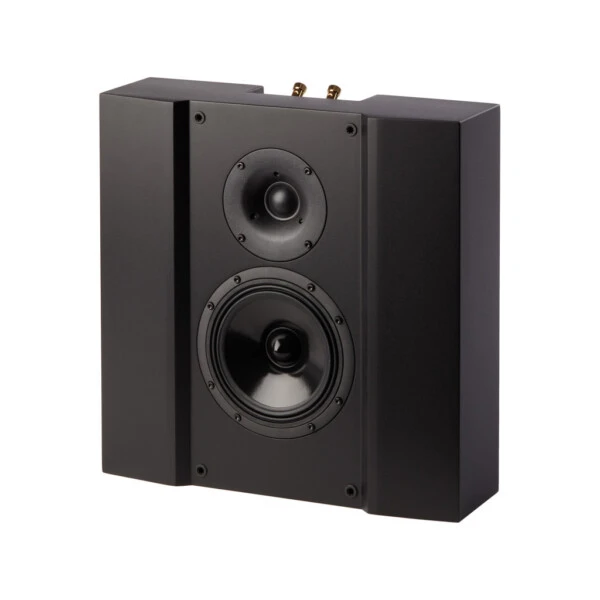 L’enceinte 6.1H est un modèle compact deux voies conçu pour être installée derrière un écran ou bien encastré dans le mur. Elle peut jouer le rôle d’enceinte principale ou bien d’enceinte surround. Tous les éléments du coffret sont boulonnés entre eux. Les attaches sont intégrées pour une fixation murale via deux vis. Une rainure est prévue à l’arrière pour faire passer le câble haut-parleur sans surépaisseur. Le bornier plaqué or prend place dans un renfoncement. La 6.1H reçoit une peinture noir mat texturée.