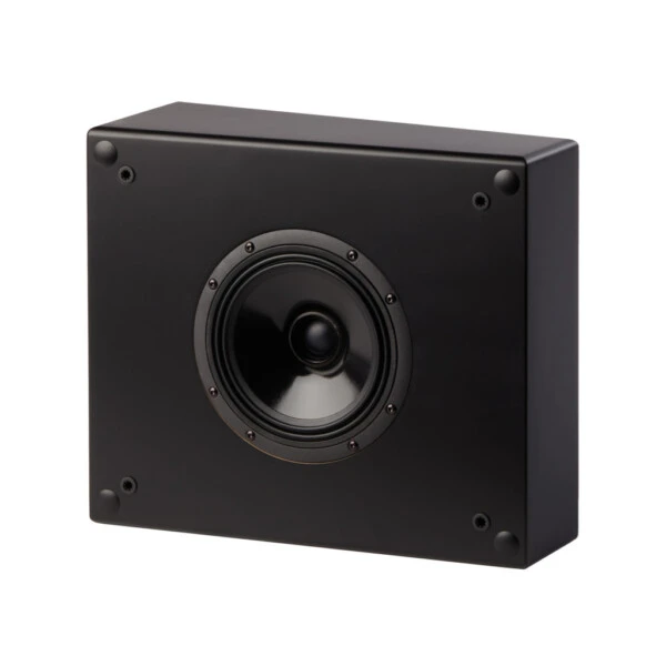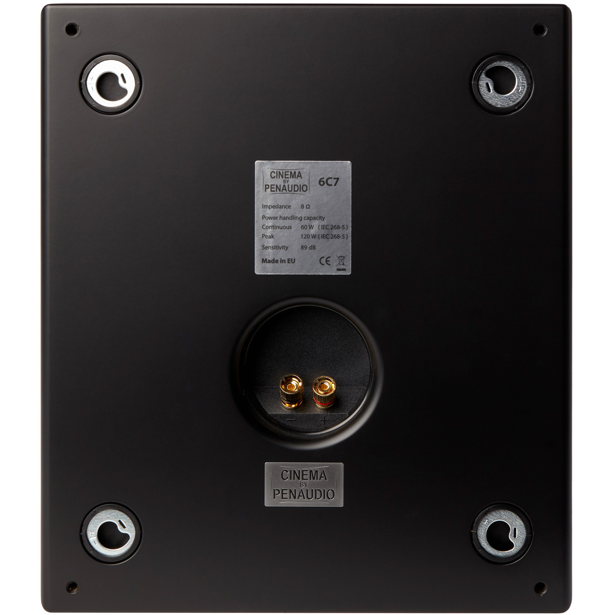 La 6C7 possède un baffle orienté de 7° vers les spectateurs pour une meilleure diffusion des effets sonores en hauteur. Les attaches sont déjà intégrées au coffret, sans surépaisseur. Les vis de blocage sont accessibles directement à l’avant de l’enceinte pour faciliter son installation. Tous les éléments du coffret sont boulonnés entre eux. Le bornier plaqué or prend place dans un renfoncement à l’arrière. La 6C7 reçoit une peinture noir mat satinée.
