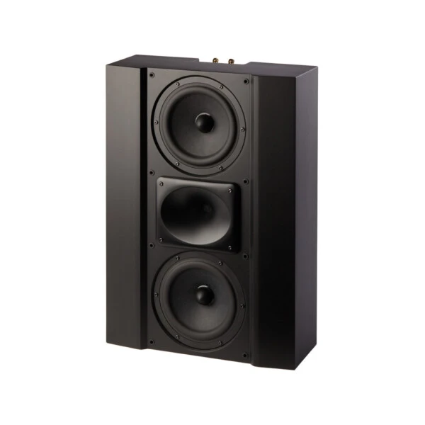 L’enceinte 8.2H est un modèle deux voies conçu pour être installée derrière un écran ou bien encastré dans le mur. Elle se différencie de la 8.1H par l’ajout d’un second médium de 20 cm placé au-dessus du tweeter. Elle peut jouer le rôle d’enceinte principale associée à des 8.1H en surround. Tous les éléments du coffret sont boulonnés entre eux. Les attaches sont intégrées pour une fixation murale via deux vis. Une rainure est prévue à l’arrière pour faire passer le câble haut-parleur sans surépaisseur. Le bornier plaqué or prend place dans un renfoncement. La 8.2H reçoit une peinture noire texturée.