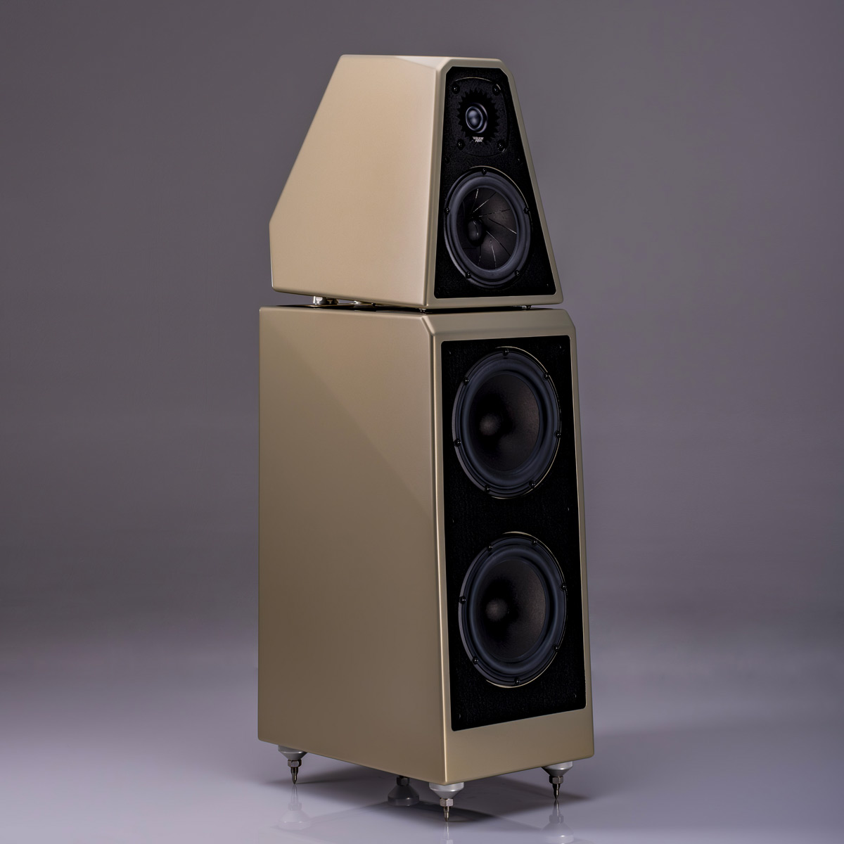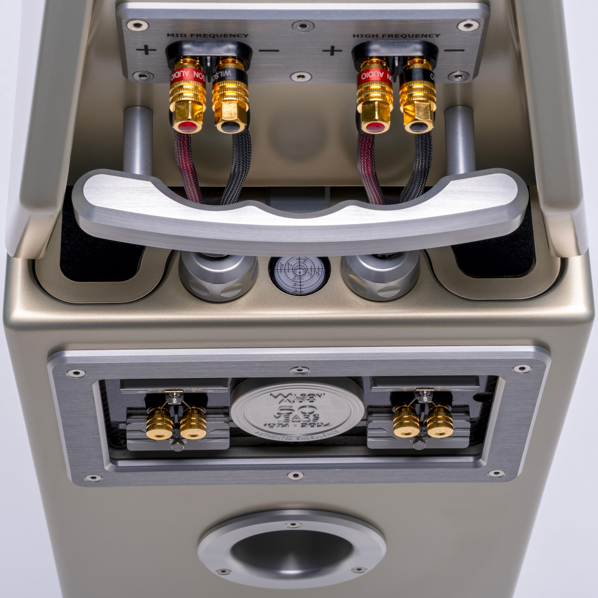Cette WATT/Puppy représente ce qu’aurait pu créer Dave Wilson il y a 50 ans s’il avait eu à sa disposition les ressources de Wilson Audio d’aujourd’hui. Elle est toujours constituée de deux coffrets : une tête médium/aigu reposant sur l’unité de grave, une plaque en V-Material servant d’interface entre les deux. Des pointes ajustables et un niveau à bulle permettent de régler l’angle finement entre les deux. Les X-Material et S-Material sont également présents à d’autres endroits de l’enceinte. Du côté des haut-parleurs, les basses fréquences sont confiées à une doublette de woofers de 20 cm. Le médium QuadraMag est constitué d’un mélange AlNiCo déjà présent sur les plus grands modèles Wilson. Enfin, le tweeter CSC prend place au somment de la WATT/Puppy moderne.